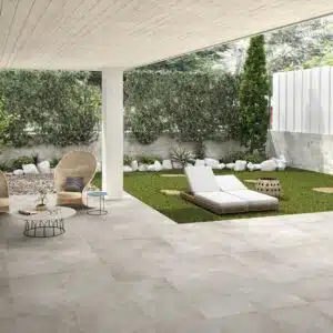 - Alta resistencia: El porcelánico imitación cemento es resistente a rayones, manchas y cambios de temperatura, lo que lo hace ideal para exteriores.